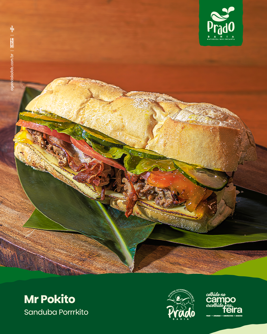 Baguete ao azeite de ervas, recheada com carne de porco desfiada, temperada com ervas frescas, queijo coalho tostado, bacon, salada fresca de tomate, rúcula e pepino, finalizado com molho Barbecue de Manga com Pimenta da casa.