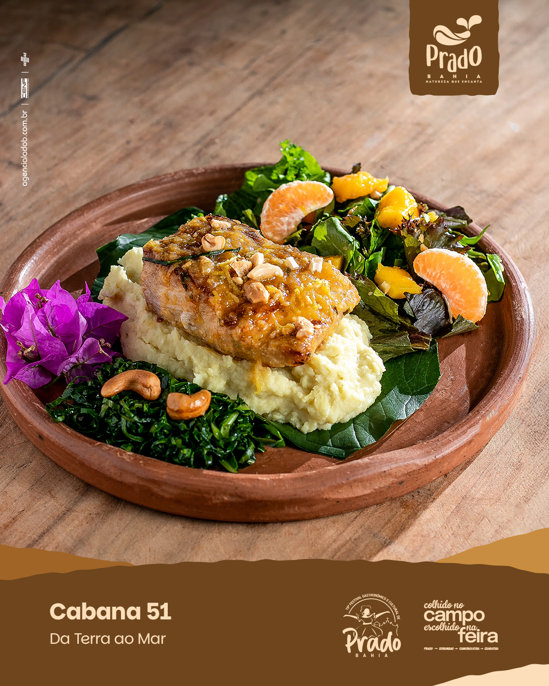 Filé de peixe fresco, grelhado no ponto perfeito, recebe a leveza de um molho cítrico feito com limão-siciliano e tangerina, que realça seus sabores naturais. Acompanhado de um cremoso purê de batata-doce, que traz suavidade e aconchego, taioba refogada no azeite e mix de folhas frescas, castanhas com cubos de manga que acrescentam frescor e doçura tropical. Uma combinação equilibrada, colorida e irresistível, que une o melhor do campo, da feira e do mar em um só prato.