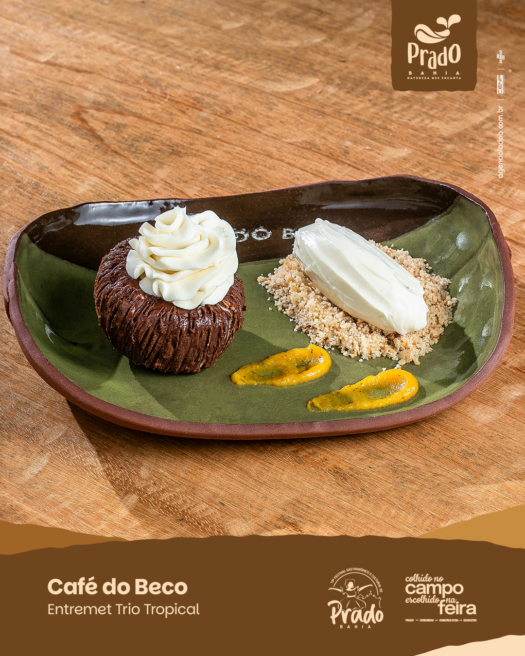 Uma composição que celebra a pureza dos sabores tropicais. Mousse de coco aerada com um centro fluído de gel de maracujá e manga em cubos. Envolta em chocolate amargo 70% e coberta por uma ganache de coco. Servida com sorvete de coco, farofa de beiju e pontos de gel de maracujá para uma experiência completa.
