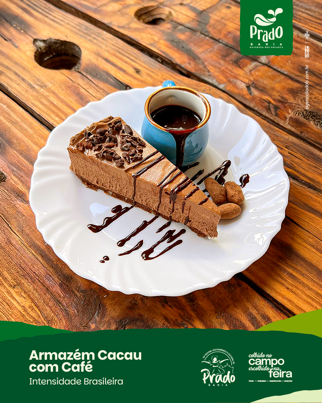 Torta mousse de chocolate aveludado, ganache intensa de café e nibs de cacau crocante. Uma sobremesa que traduz os sabores do campo baiano e a tradição da feira, com a delicadeza de uma criação da Dalú Confeitaria.
