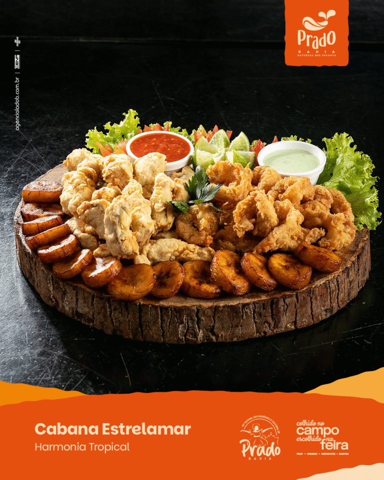 Filé de peixe e camarão empanado, acompanhado de banana-da-terra, tomate-cereja e molho da casa. 🍽️ Restaurante: Cabana Estrelamar📍Destino: Prado🍹Categoria: Petisco💰Valor: R$ 65