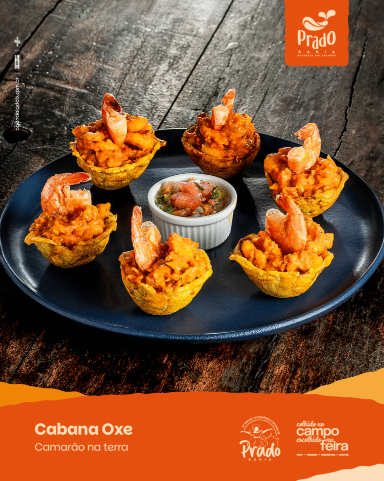 Camarão na terra: Um encontro de texturas e sabores: chips de banana-da-terra, ao molho de camarão suculento e com o toque final do camarão no dendê, acompanhado de um molho de pimenta-biquinho. Um prato intenso, envolvente e memorável, unindo sabores…